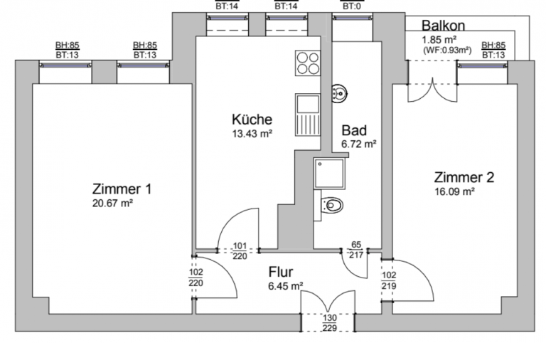 Eine Wohnfläche von ca. 64,29 m² verteilt sich auf einen Flur, zwei Zimmer, ein neu saniertes Duschbad sowie eine geräumige Küche. Das hell geflieste Badezimmer verfügt über einen Waschmaschinenanschluss und einen Handtuchwärmer. Zudem verfügt die Wohnung über einen nach Norden ausgerichteten, ca. 2 m² großen Balkon.