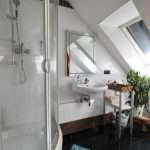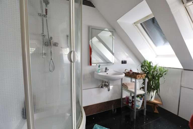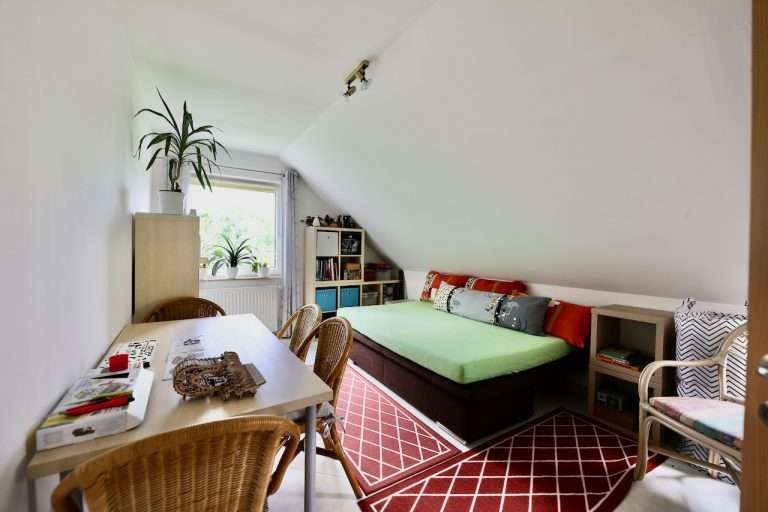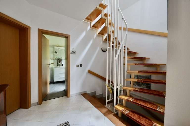 Über eine freitragende Holztreppe ist das Obergeschoss zu erreichen. Hier befinden sich der Flur; drei Schlafzimmer sowie ein großes, tagesbelichtetes Badezimmer, ausgestattet mit einer Dusche.