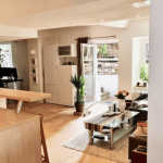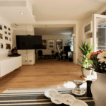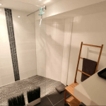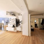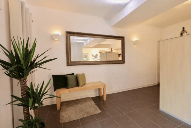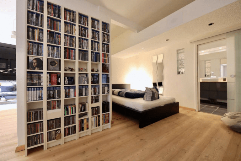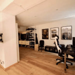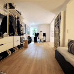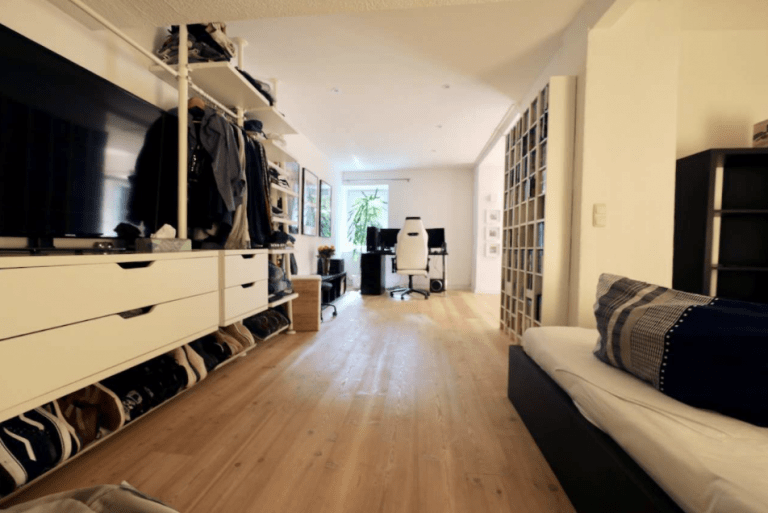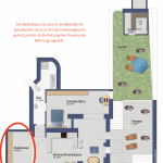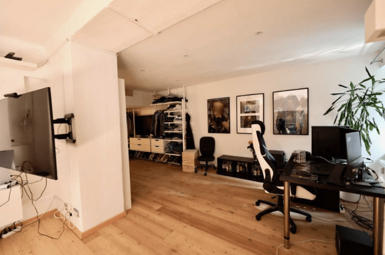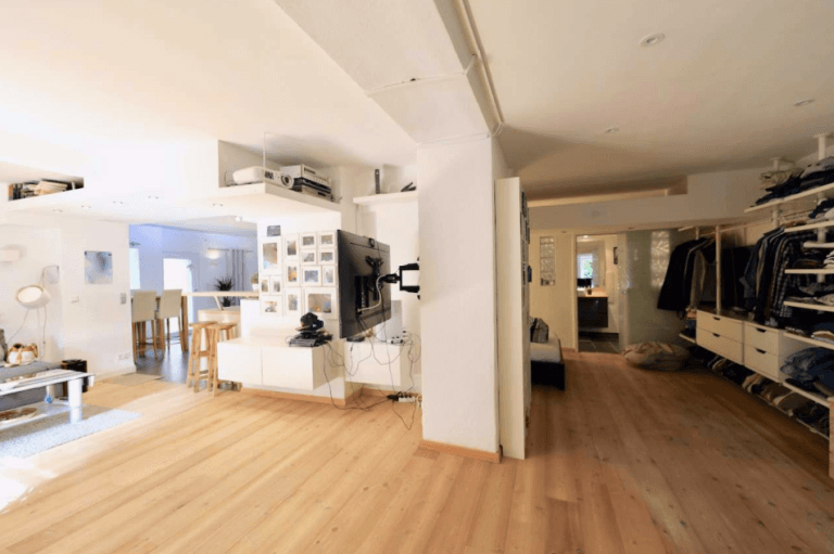 Weiterführend vom Wohnzimmer befindet sich ein Bereich, der optimal zum Arbeiten genutzt werden kann, und der zum Ankleide- sowie Schlafbereich übergeht. Von hier ist auch das Badezimmer begehbar, welches wiederum ebenso auch vom Eingangsbereich der Wohnung aus über einen kleinen Flur erreichbar ist.
