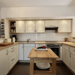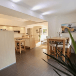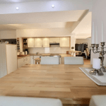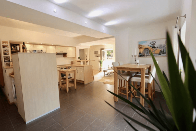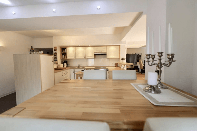 Der Eingangsbereich bietet sowohl Platz für die Garderobe als auch für einen Essbereich sowie eine großzügige, gut ausgestattete und offene Einbauküche. Die Einbauküche beinhaltet viel Stau- und Arbeitsfläche sowie einen Tresenbereich, und sie ist auch zum Wohnzimmer offen gehalten.