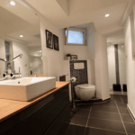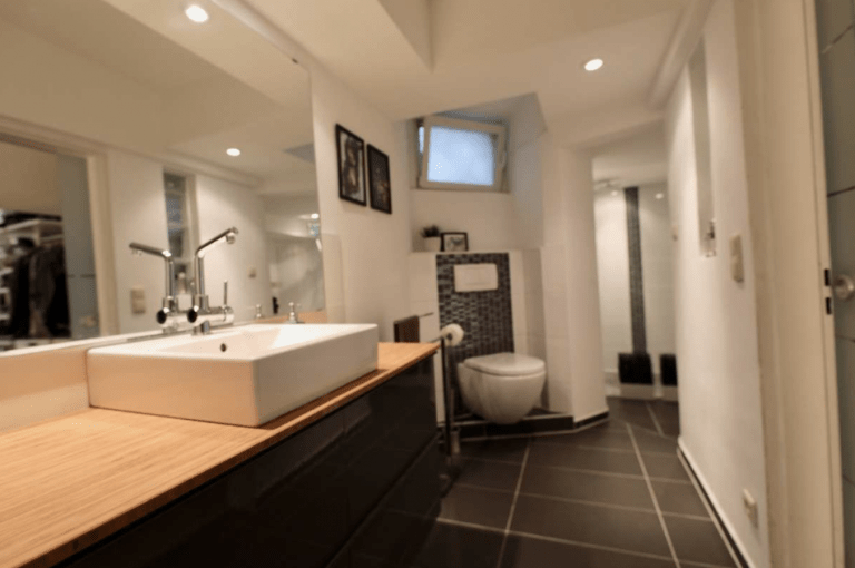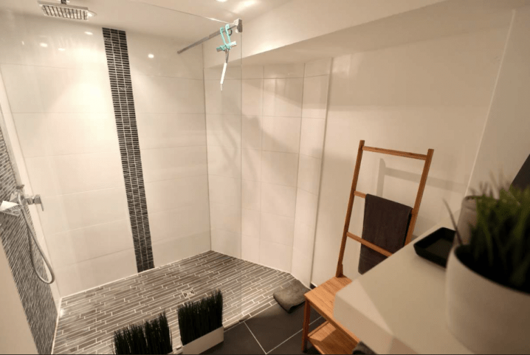 Das Badezimmer hat eine komfortable Größe von gut 11 m², ist mit hellen Farben (Wand- und Bodenfliesen) gestaltet und verfügt über einen separaten Duschraum. Eine Fußbodenheizung sorgt für luxuriöses Wohlbefinden.
