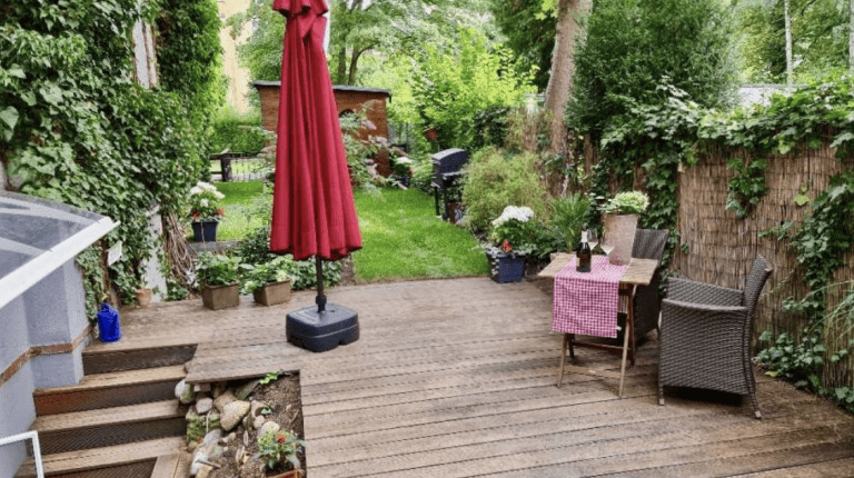 Vom Wohnzimmer und auch vom Vorgarten aus ist der Zugang zur ca. 25 m² großen, beplankten Terrasse in einem idyllischen Ambiente sowie zum südlich ausgerichteten, sonnigen und privaten Gartenbereich gegeben.