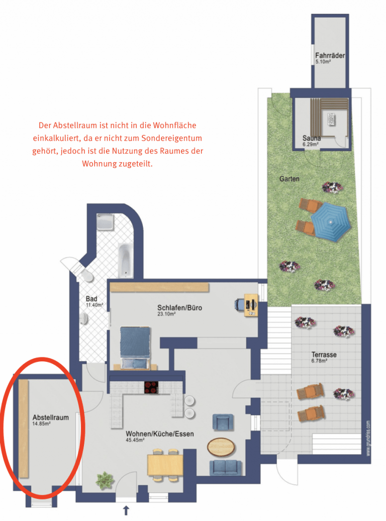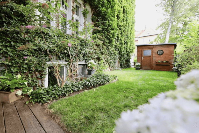 Ein Gartenhaus mit einer finnischen Blockbohlen-Sauna (ca. 2m x 2m) der Firma Weka dient zudem für Abstellmöglichkeiten für Fahrräder und Gartengeräte und auch zur räumlichen Abtrennung zum ca. 300 m² großen, gemeinschaftlichen Garten, der sich auf dem hinteren Teil des Grundstücks befindet.