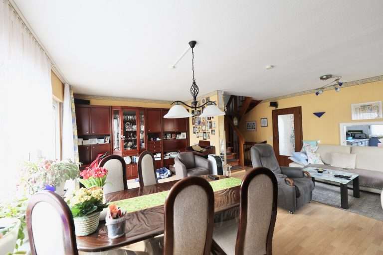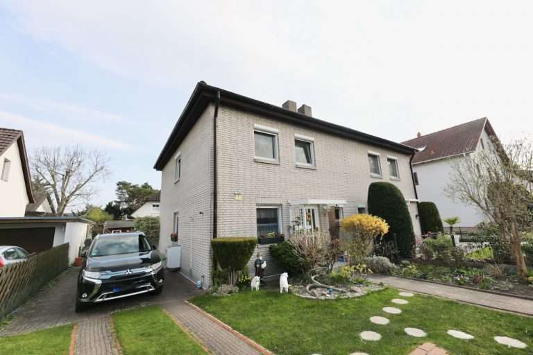 Die gepflegte Doppelhaushälfte, ein Fertighaus der Marke Hansehaus, wurde 1990 auf dem ca. 312 m² großen Grundstück erbaut und hat eine Wohnfläche von ca. 100m², die sich über ein Erdgeschoss und ein Obergeschoss verteilt, sowie eine weitere Nutzfläche im Kellergeschoss von ca. 34m².