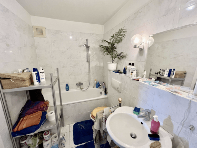 Das Badezimmer ist mit einer Badewanne ausgestattet. Hier befindet sich auch der Waschmaschinenanschluss.