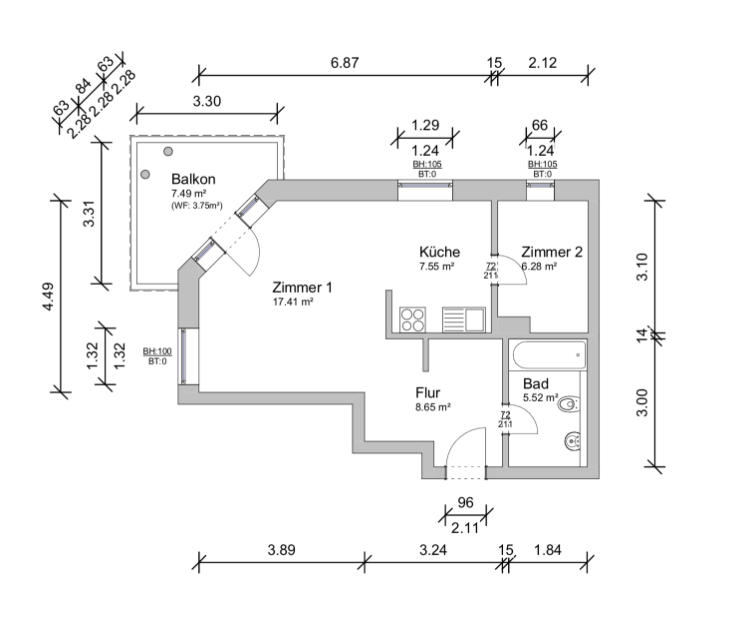 Auf einer Wohnfläche von ca. 49 m² verteilen sich ein Eingangsbereich, ein Wohnzimmer, eine Küche, ausgestattet mit einer hellen Einbauküche welche zum Wohnzimmer offen gestaltet ist, ein modernes Badezimmer sowie ein kleines Schafzimmer. Ein überdachter, großzügiger Balkon bietet einen schönen Blick auf die Grünanlage.