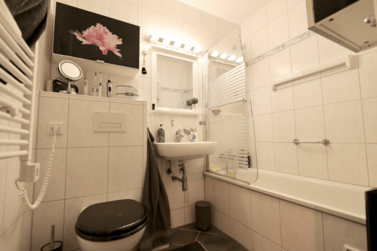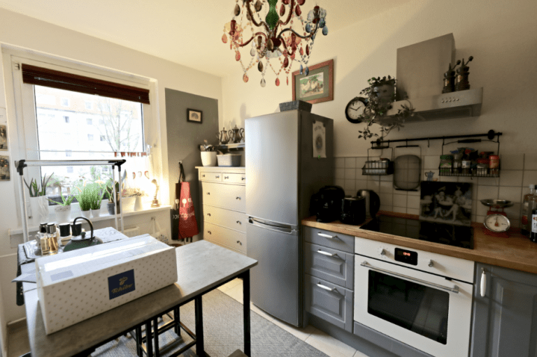 Auf ca. 53 m² verteilen sich ein Flur, ein hell gefliestes Wannenbad mit Handtuchwärmer, ein Schlafzimmer sowie ein Wohnzimmer mit Zugang zur großzügigen Küche, welche mit einer Einbauküche ausgestattet ist und genügend Platz für eine Sitzecke bietet. Der Waschmaschinennaschluss ist hier ebenfalls vorhanden.