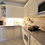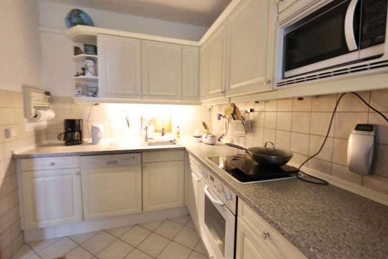 Die Wohnfläche von ca. 59 m² verteilt sich auf einen Flur; ein Badezimmer, ausgestattet mit einer Badewanne; zwei Schlafzimmer, wobei in einem Schlafzimmer das Splitgerät der Klimaanlage vom Wohnzimmer untergebracht ist; ein südlich ausgerichtetes Wohnzimmer mit Klimaanlage sowie eine Küche, ausgestattet mit einer Einbauküche und Markengeräten der Firma AEG, einschließlich Induktionsherd. In der Küche ist zudem Platz für einen kleinen Essbereich vorhanden.