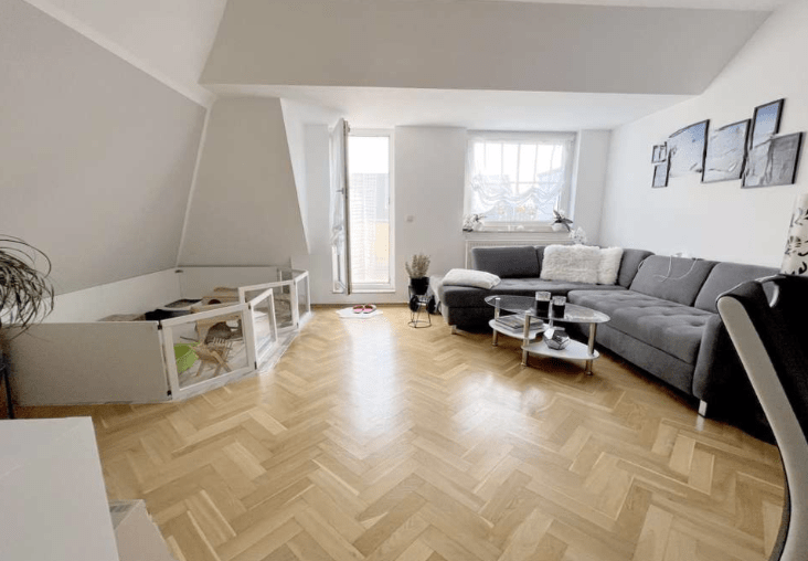 Im Wohnzimmer wurde ein schöner Parkettfußboden in Fischgrätoptik verlegt, im Flur und im Schlafzimmer ein pflegeleichter Vinylboden. Die Wände sind mit einer Tapete versehen, und die Deckenhöhe beträgt ca. 1.50 m².