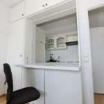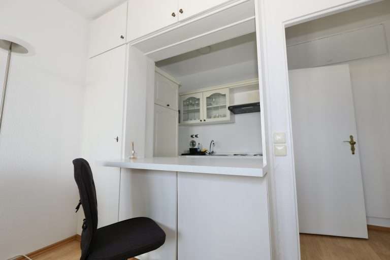 Die Wohnfläche verteilt sich auf einen Eingangsbereich mit ausreichend Platz für eine Garderobe, ein Badezimmer, das mit einer Badewanne ausgestattet ist, einen Wohn-/Schlafzimmerbereich sowie eine Küche mit heller Einbauküche, die durch einen Tresen offen zum Wohnraum gestaltet wurde.
