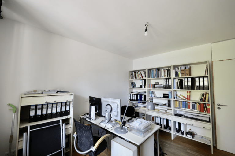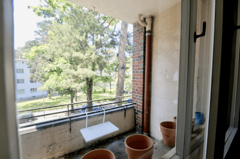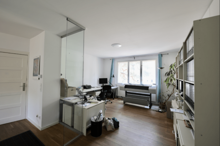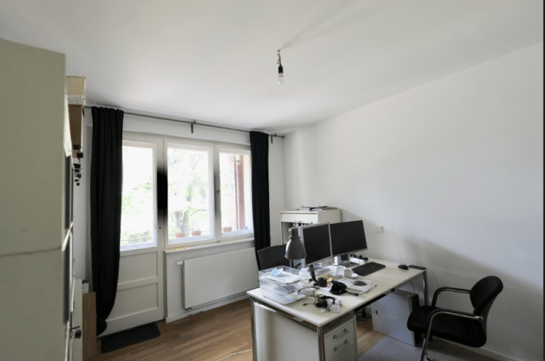 Das Wohnzimmer und ein Schafzimmer mit Zugang zur kleinen West-Loggia sind zur Straße ausgerichtet. Das zweite Schlafzimmer, die Küche und das tagesbelichtete Badezimmer sind zur Gartenseite gelegen.