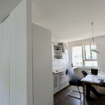 Die schöne Küche ist mit einer weißen Einbauküche ausgestattet und bietet genügend Platz für einen Esstisch.