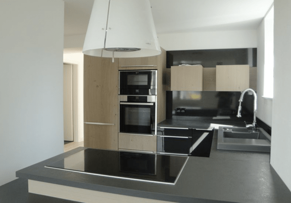 Im Erdgeschoss befindet sich eins der zwei Schlafzimmer, ein Duschbad und eine hochwertige, offene Küche sowie das große Wohnzimmer. Die vier Meter hohen Fenster und die Galerie geben dem Wohnzimmer eine helle und loftartige Atmosphäre. Vom Wohnzimmer aus kann man den Blick auf die Terrasse und den großen Garten genießen.