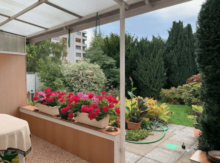 Vom Wohnzimmer aus sind die überdachte, südlich ausgerichtete Terrasse und der Garten zu begehen - genügend Platz zum Grillen oder zum Sonnen,