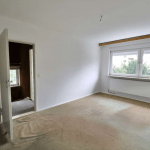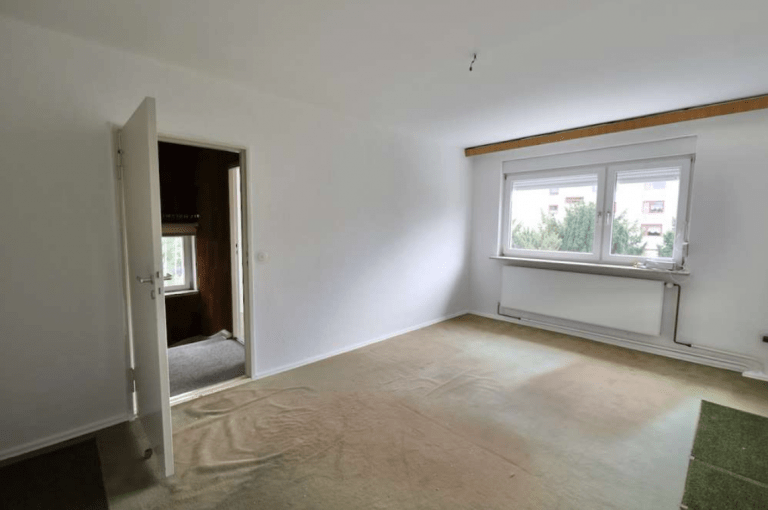 Das Wohnzimmer ist mit Stäbchenparkett ausgestattet, der Eingangsbereich ist gefliest, und die oberen Räume sind mit einer Auslegware versehen.