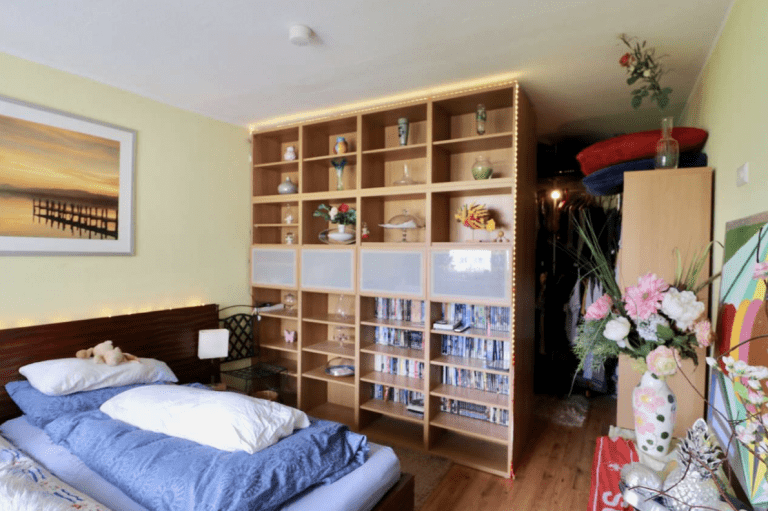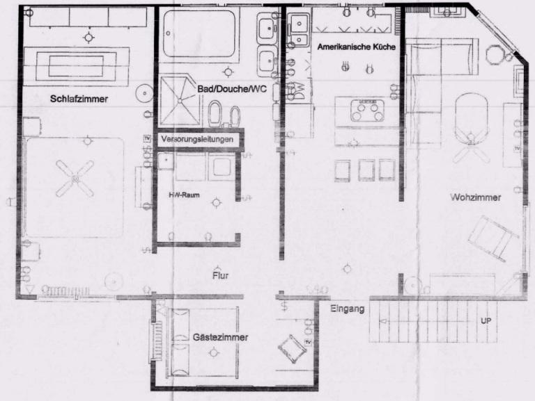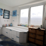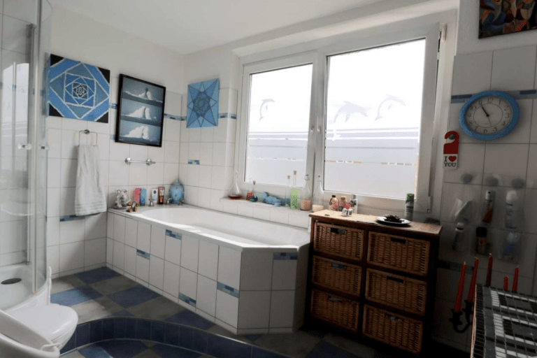 Das Badezimmer ist modern, und die sanitären Elemente sind funktional angeordnet. Eine Badewanne und eine separate Dusche sorgen für einen hohen Komfort. Eine Abstellkammer bietet funktionalen Stauraum sowie Platz für die Waschmaschine und den Trockner.