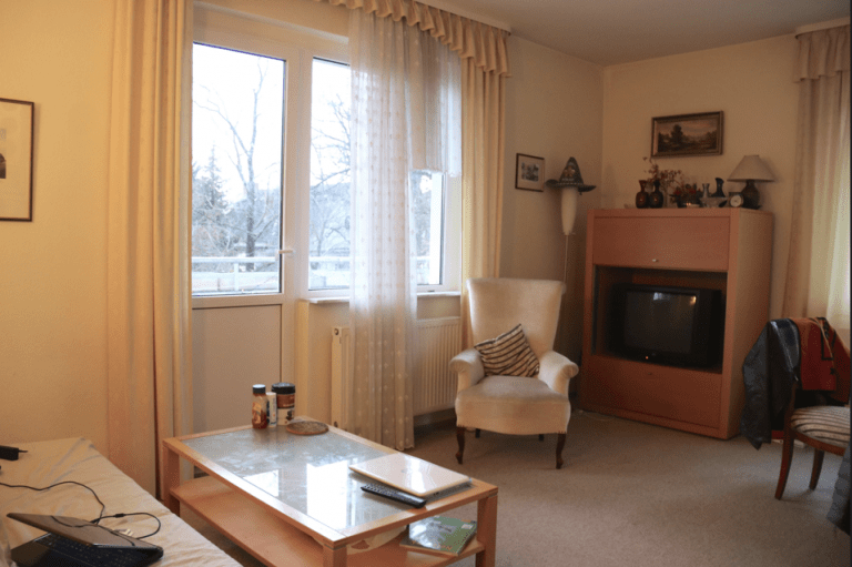 Das geräumige Wohnzimmer hat einen direkten Zugang zu dem großzügigen Balkon, der an warmen Sommertagen für ein entspanntes Frühstück oder auch abends für ein Glas Wein genutzt werden kann.