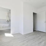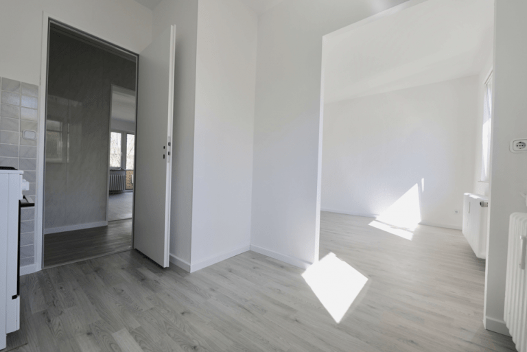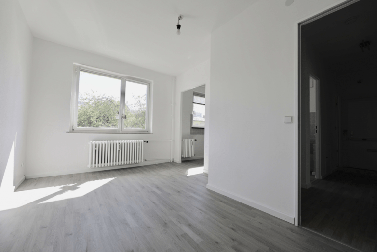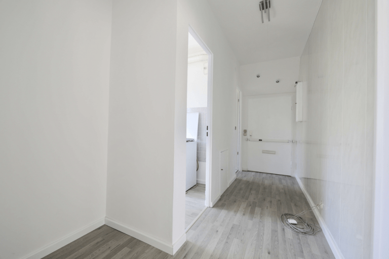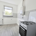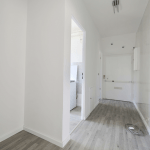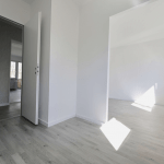 Die Renovierung wurde gerade abgeschlossen, es wurde ein neuer Laminatboden in hellem Grau verlegt. Die Wände sind teilweise tapeziert und frisch gestrichen, teilweise auch glatt verputzt. Eine Wand im Flur ist mit glänzenden Kunststoffpanelen versehen. Es wurden höhere Türen eingesetzt, die einen großzügigeren Eindruck vermitteln. Türgriffe können von einem neuen Eigentümer noch je nach Geschmack eingesetzt werden. Die Kunststofffenster sind dreifach verglast.
