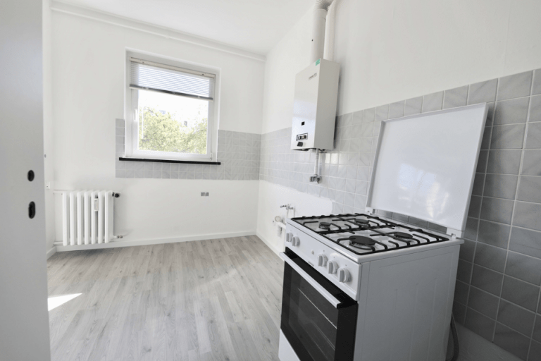 Es wurde ein Durchgang von der Küche zu dem danebenliegenden Zimmer geschaffen, wodurch die beiden Räume jeweils größer wirken. Bei Bedarf kann dieser aber auch mit einfachen Mitteln wieder geschlossen werden, z.B. auch durch eine Schiebetür oder eine Falttür. Die Küche ist mit einem Gasherd ausgestattet.