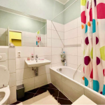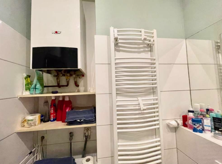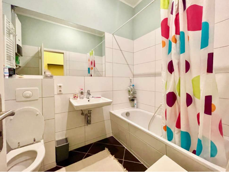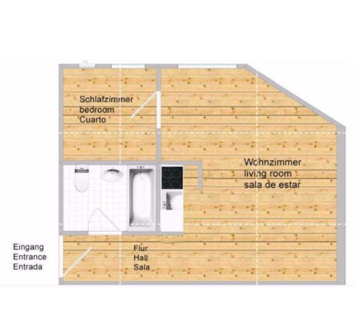 Auf ca. 29 m² verteilen sich ein Flur, ein Badezimmer, welches über eine Badewanne und Handtuchwärmer verfügt, ein Wohnzimmer mit einer Küchenzeile und ein Zimmer als Schlafbereich.