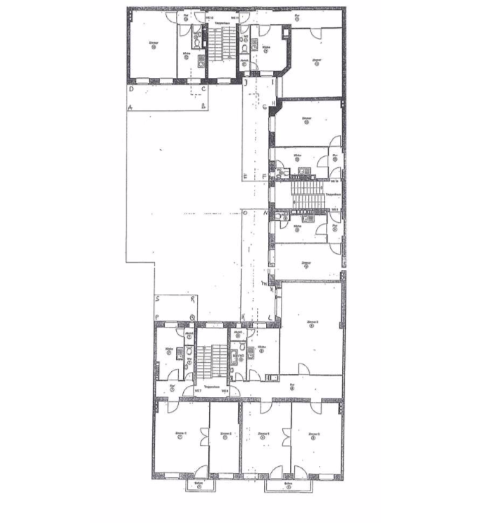 Das 1904 erbaute Wohnhaus ist in ein Vorderhaus, ein Hinterhaus und einen Seitenflügel aufgeteilt.