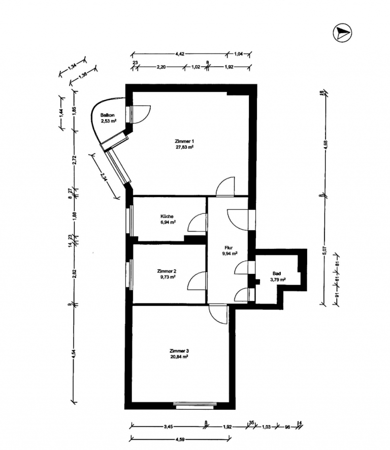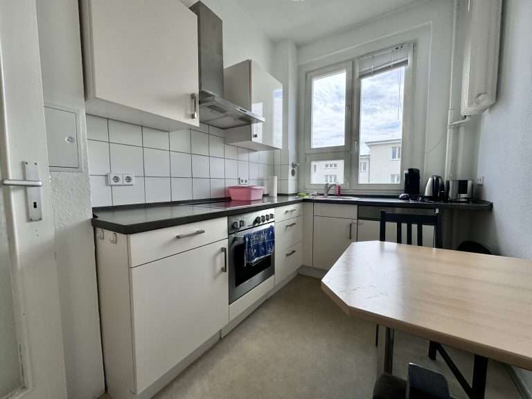 Auf ca. 80,34 m² verteilen sich ein Flur; ein Badezimmer mit Dusche sowie Waschmaschinenanschluss; eine Küche, ausgestattet mit einer hellen Einbauküche und genügend Platz für eine kleine Sitzecke; zwei Schlafzimmer und ein südlich ausgerichtetes Wohnzimmer. Von hier ist der ca. 2,5 m² große Balkon zu begehen, welcher einen direkten Blick auf das Schöneberger Rathaus bietet. Alle Räume sind vom Flur begehbar.