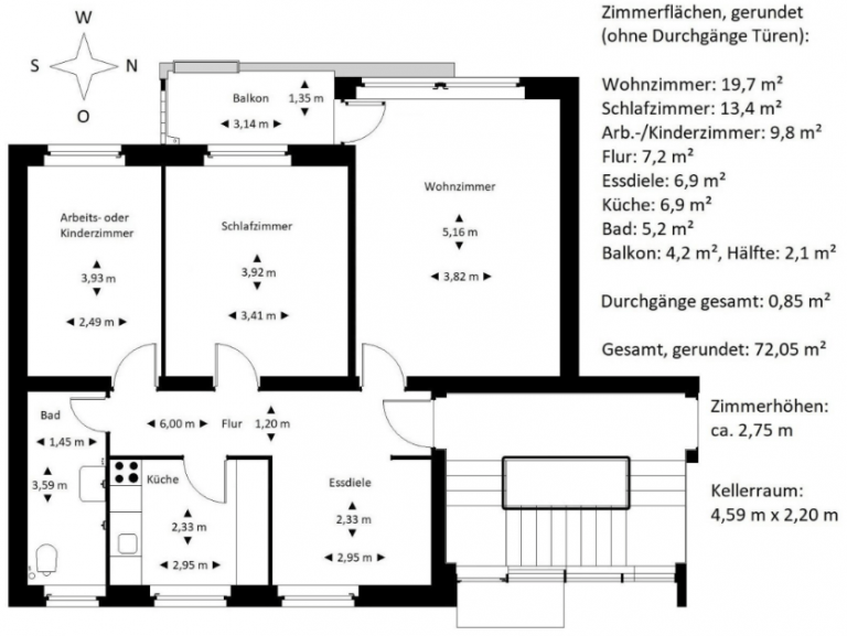Die Raumhöhen betragen ca. 2,75 Meter.