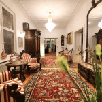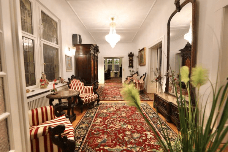 Das Entree bietet Platz für die Garderobe,. Vom geräumigen Flur aus sind fünf repräsentative Zimmer zu begehen, eines davon mit Zugang zum Wintergarten. Die Durchgangszimmer sind mit hochwertigen Schiebetüren gemäß den originalen Türen und Türportalen ausgestattet.