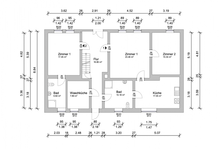 Das Haupthaus verfügt über eine Erdgeschoss- und eine Obergeschossebene Zudem ist ein Dachboden vorhanden. Eine Wohnfläche von ca. 227 m² und eine Nutzfläche von ca. 38,48 m² verteilt sich auf insgesamt acht Zimmer, sowie ein halbes Zimmer, drei Bäder, das vierte ist in Planung, und zwei mit Einbauküchen ausgestattete Küchen.