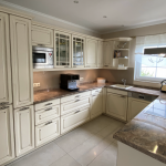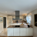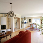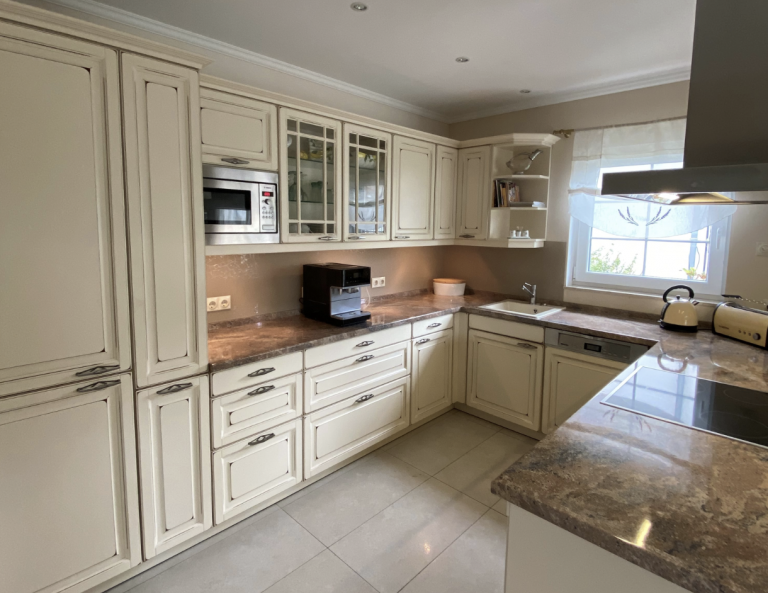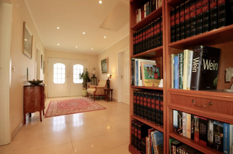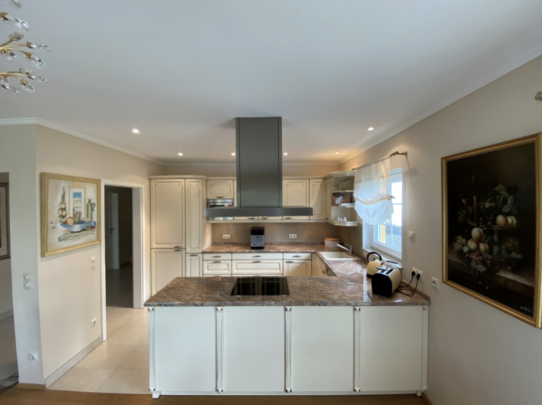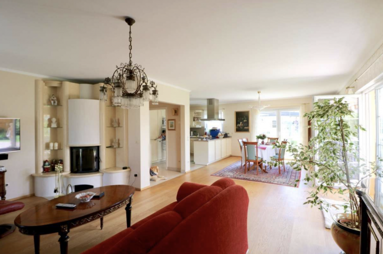 Herzstück des Bungalows ist der ca. 45m² große Wohn-/Essbereich mit offener Küche, welche mit einer hochwertigen Einbauküche (Neuwert ca. 30.000 EUR) ausgestattet ist. Die drei bodentiefen, doppelflügigen Fenster fungieren als Türen und ermöglichen direkten Zugang zum Garten bzw. zur Auffahrt. Das Wohnzimmer beinhaltet einen exklusiven Marmor-Eckkamin, der zu gemütlichen Stunden insbesondere in den Wintermonaten einlädt.