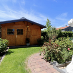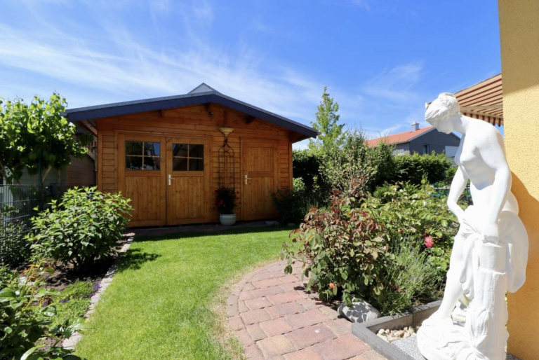 Gartenmöbel und -geräte finden Platz in einem großen Gartenhaus. Zusätzlicher Stauraum ist im Dachboden geboten.