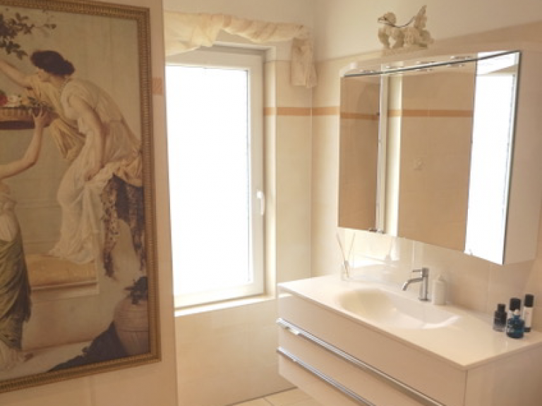 Zudem stehen in einer beheizten und hochwertig ausgestatteten Anbaugarage ein PKW-Stellplatz und drei weitere PKW-Stellplätze auf dem Grundstück zur Verfügung. Sowohl das Rolltor als auch das Schiebetor sind bequem aus dem Fahrzeug heraus über eine Fernbedienung elektrisch steuerbar. Die Garage verfügt über einen direkten Zugang zum Garten.