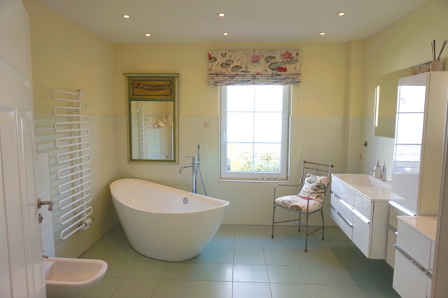 Zwei Schlafzimmer, ein Duschbad und ein Wannenbad stehen zur Verfügung. Weiterhin ist ein praktischer Abstellraum und ein großer Hauswirtschaftsraum mit Tageslicht vorhanden, in dem auch die Haustechnik untergebracht ist.