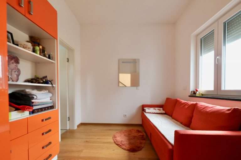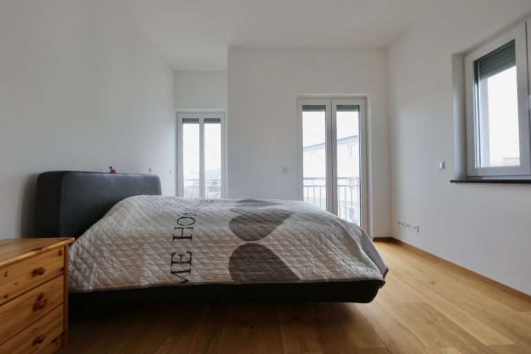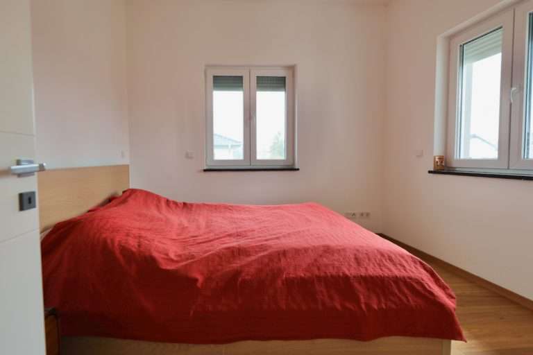 Die größtenteils bodentiefen Kunststofffenster mit dreifacher Verglasung und Argongas-Füllung bieten exzellenten Wärme- und Schallschutz und sind mit elektrisch bedienbaren Jalousien und Insektenschutz ausgestattet.