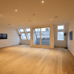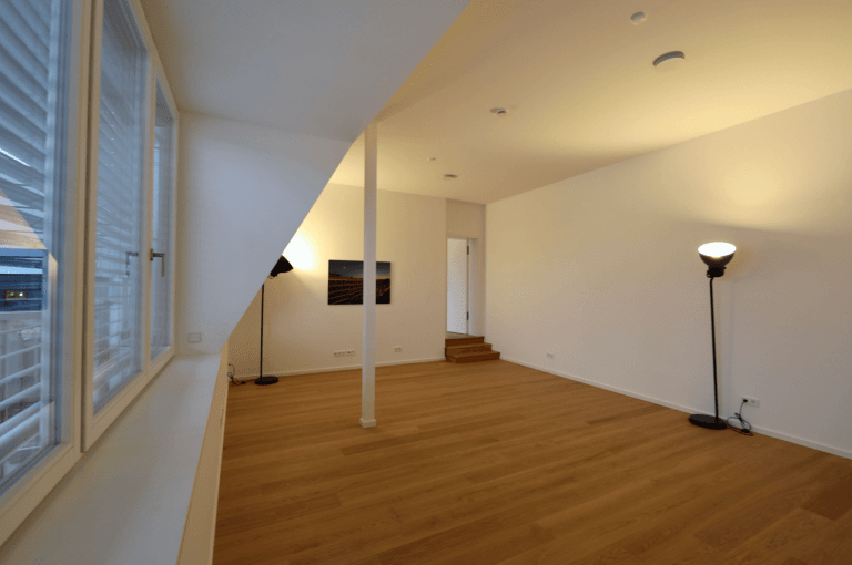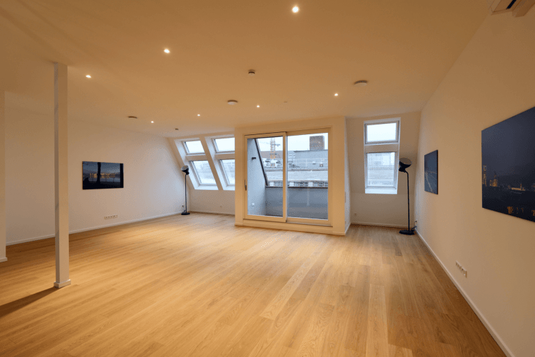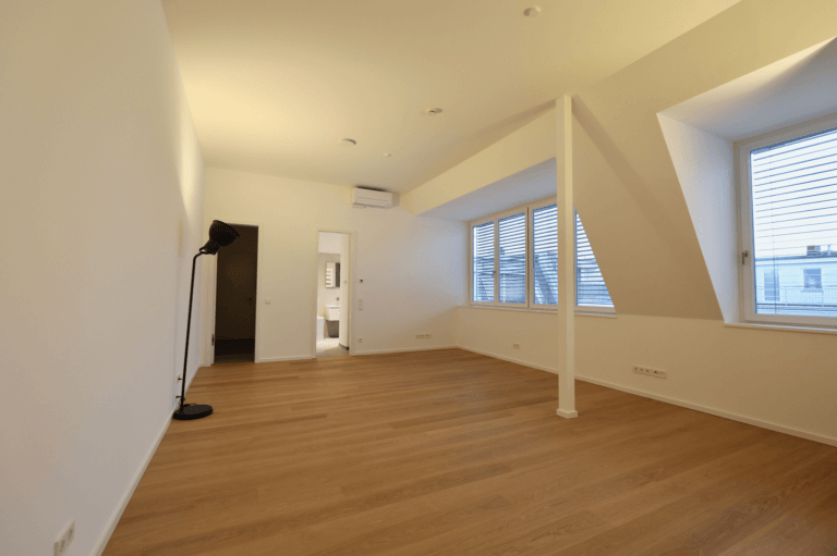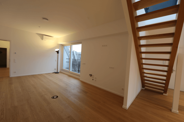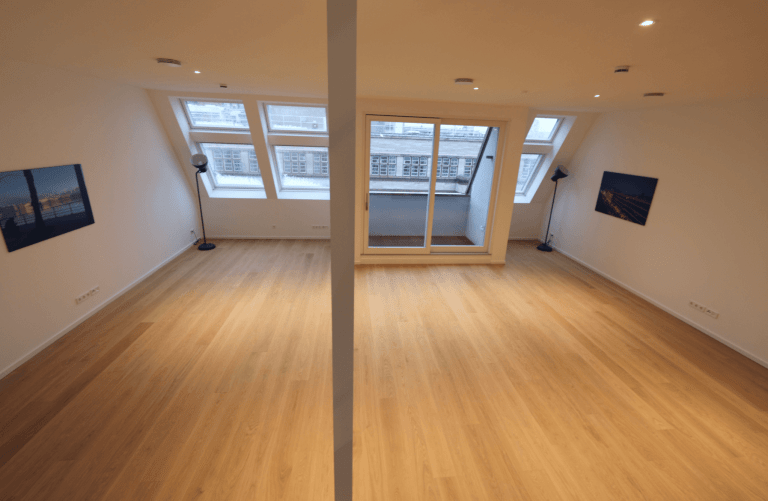 Die Dachgeschosswohnung erstreckt sich vom Vorderhaus bis in den Seitenflügel und verfügt über ca. 164 m² Wohnfläche. Vom Eingangsbereich erschließt sich das ca. 70 m² große, loftartige Wohnzimmer mit Zugang zur Loggia und zur Aufdachterrasse mit einem imposanten Panorama-Blick über unsere geliebte Hauptstadt.