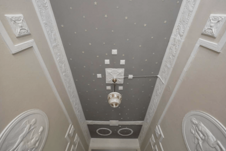 Die Wohnräume und der Flur sind mit Parkettboden ausgestattet, die Küche und das Badezimmer sind hell gefliest. Die Doppelkastenfenster bestehen aus Holz, und die Wände sind tapeziert. In einem Raum ist noch der originale Deckenstuck vorhanden.