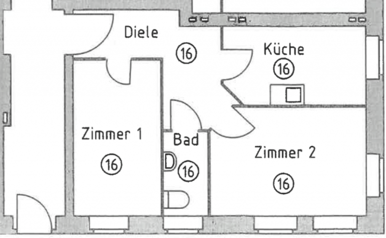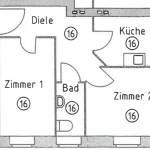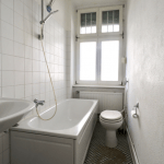 Neben dem Wohnungseingang befindet sich das erste der beiden Zimmer und daneben das tagesbelichtete Badezimmer, welches mit einer Badewanne ausgestattet ist.