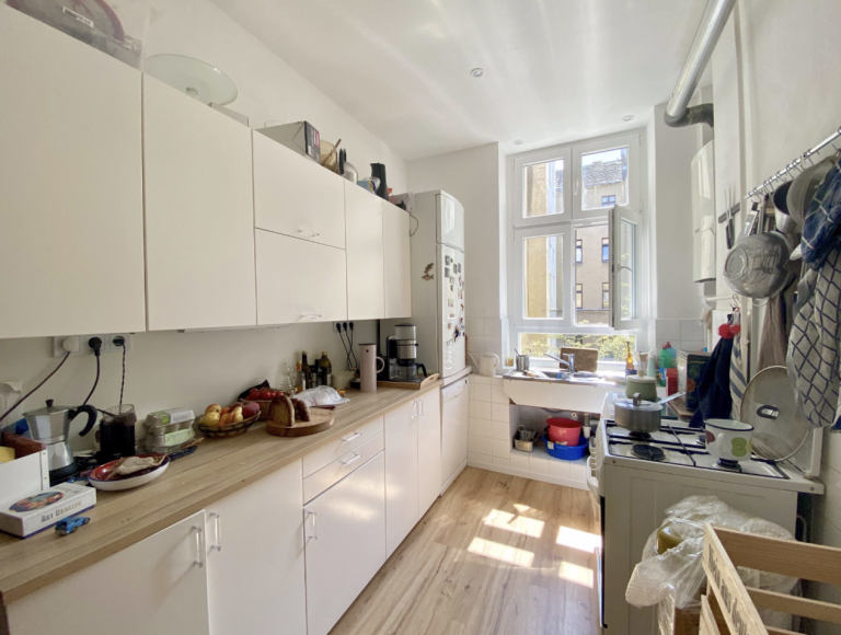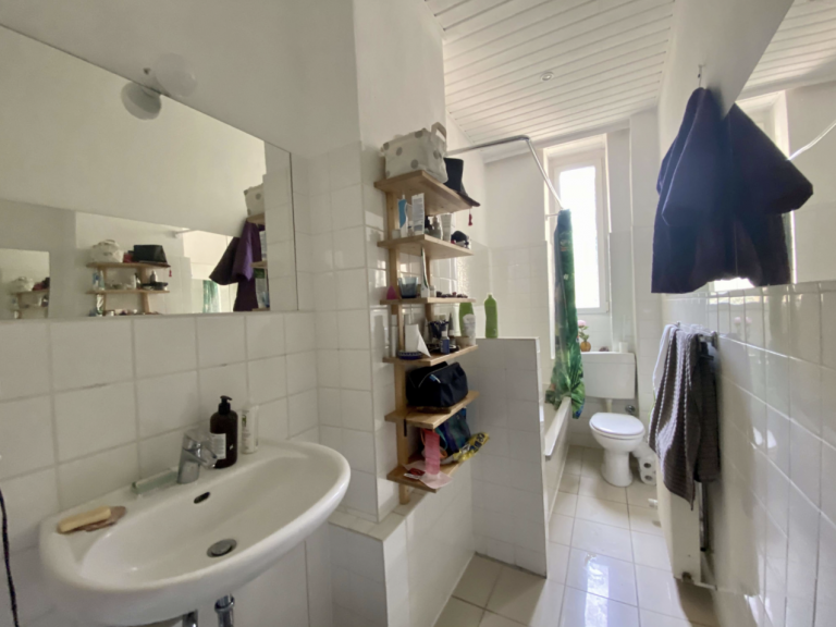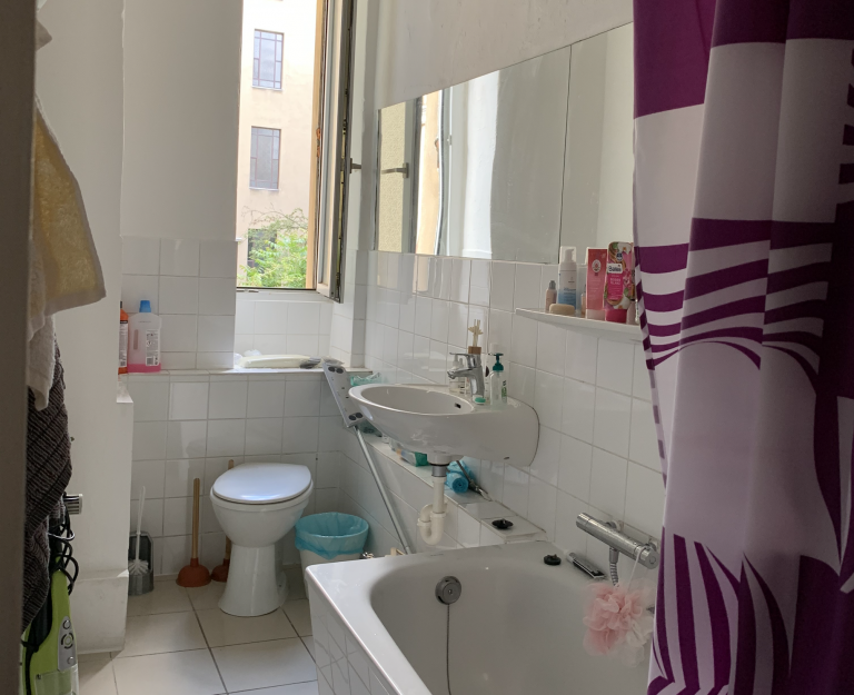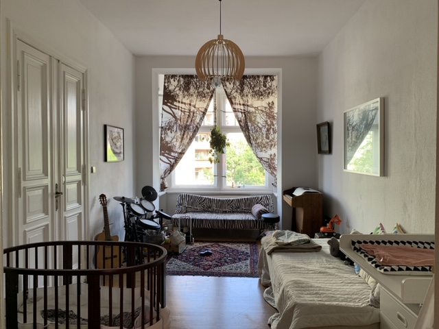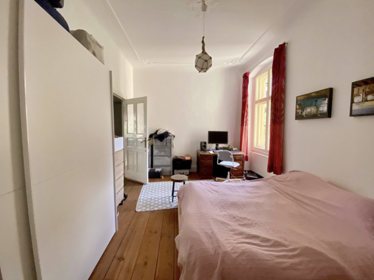 Die Wohnung ist im 2. Obergeschoss des Vorderhauses gelegen und überzeugt auf einer Wohnfläche von ca. 116 m². Diese verteilt sich auf vier Zimmer, zwei Badezimmer, die jeweils mit einer Badewanne ausgestattet sind, und eine Küche. Die Küche wurde mit einer Einbauküche ausgestattet. Die östlich ausgerichtete Loggia ist vom Wohnzimmer aus zugänglich.