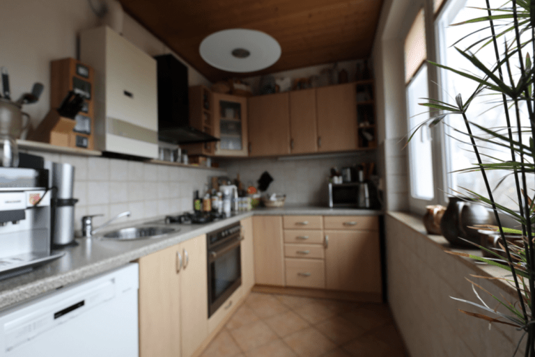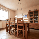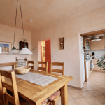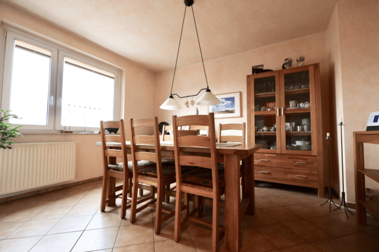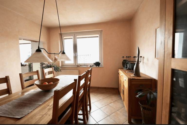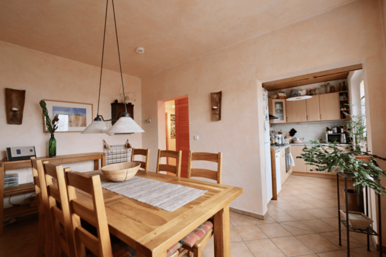 Auf einer großzügigen Wohnfläche von ca. 134 m² verteilen sich insgesamt zwei Flure, vier Zimmer und vier halbe Zimmer, zwei Badezimmer und eine Küche. Letztere ist mit einer Einbauküche und einem Gas-Herd ausgestattet. Die in der Küche und im Esszimmer verlegten Terrakotta-Fliesen harmonieren mit den Farben der Einbauküche und verleihen sowohl der Küche als auch dem angrenzenden Esszimmer eine warme Wohn-Atmosphäre.