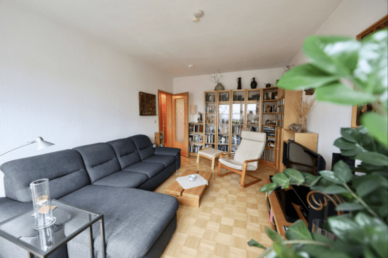 Im Wohnzimmer ist ein Stäbchenparkettboden und in den restlichen Wohnräumen ist ein heller Laminatboden verlegt.
