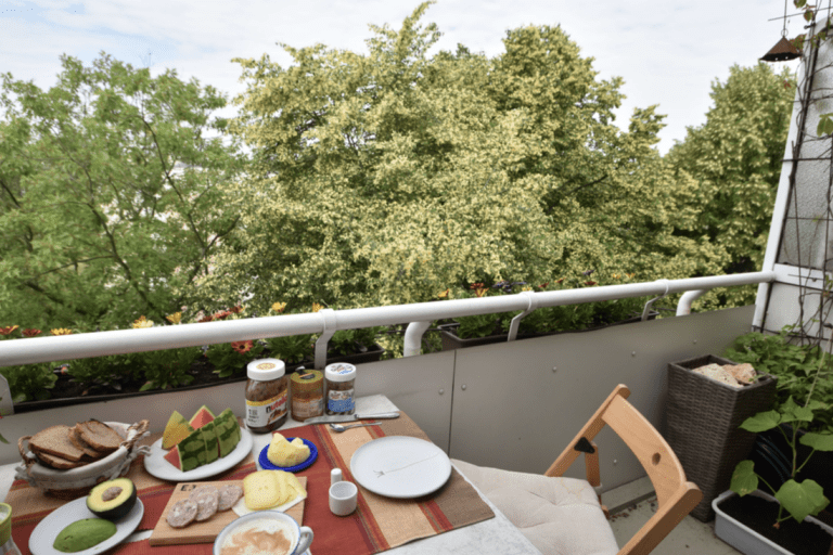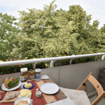 Der westlich ausgerichtete Balkon des Wohnzimmers lädt zu entspannten Stunden mit einem Blick ins Grüne ein.