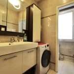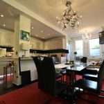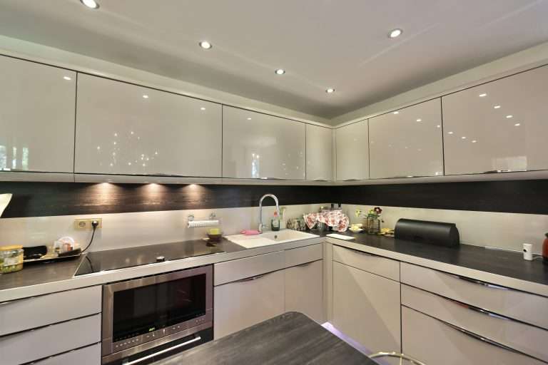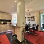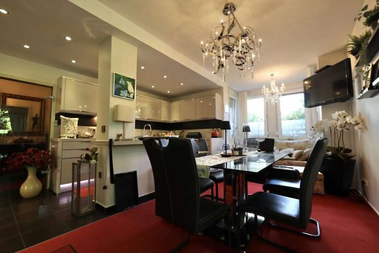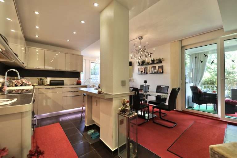 Im oberen Bereich der Wohnung befinden sich ein Flur; ein Gäste-WC; die großzügige Wohnküche, ausgestattet mit einer modernen Einbauküche mit integrierter Kaffeemaschine, Dampfgarer und ein 90 cm breites Induktionsfeld.