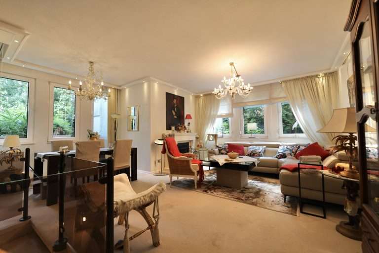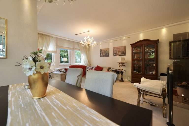 Des Weiteren liegen hier ein Schlafzimmer mit abgetrenntem Arbeitsbereich und das helle, sehr geräumige Wohnzimmer mit elektrischem Kamin und genügend Platz für eine weitere Sitzecke. Ein Wintergarten ist zudem vorhanden.