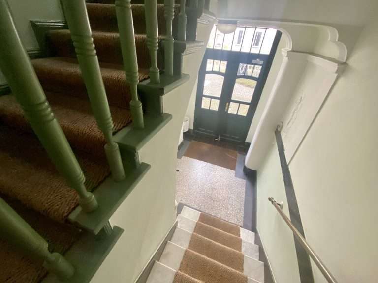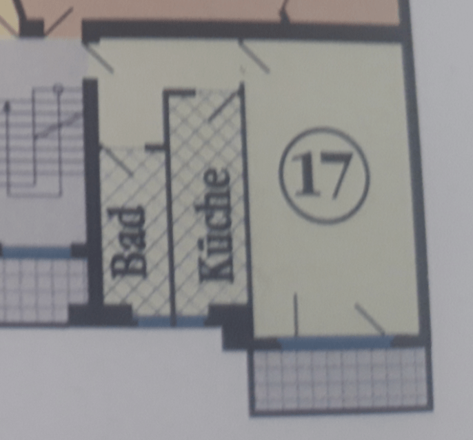 Die Wohnung befindet sich im 1. Obergeschoss des Gartenhauses. Die Wohnfläche beträgt ca. 46 m², die sich verteilen auf einen Flur, ein tagesbelichtetes Duschbad, eine Küche, die mit einer Einbauküche ausgestattet ist, und ein Wohn-/Schlafzimmer.