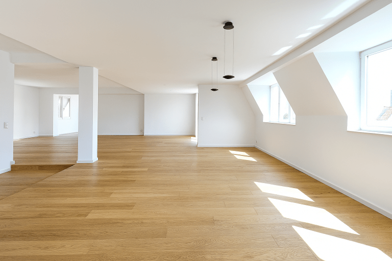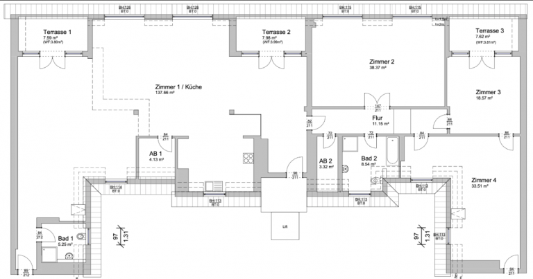 Die Wohnung besticht durch ein offenes, sehr großzügiges Raumkonzept, aufgeteilt auf vier Zimmer. Mit einfachen Mitteln könnten jedoch auch bis zu acht Zimmer geschaffen werden - bei Bedarf. Zwei Zugänge zum Treppenhaus stehen weiterhin zur Verfügung.
