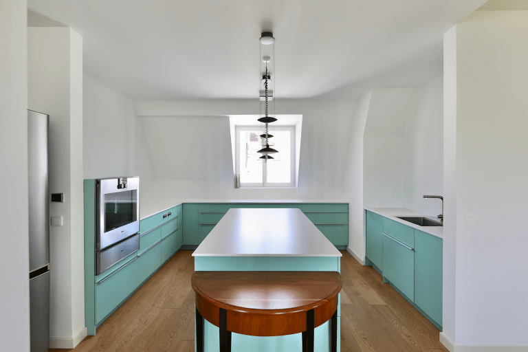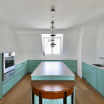 Die Küche verfügt über viel Arbeitsfläche, viel Stauraum, beinhaltet eine Kücheninsel und ist mit Gaggenau-Markengeräten und einem Gaggenau Dunstabzug ausgestattet.
