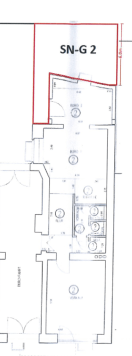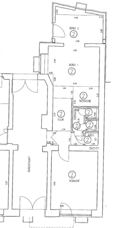 Die Gewerberäume befinden sich im Vorderhaus im Erdgeschoss und verteilen sich auf 3 Zimmer, eine kleine Küche, zwei WC´s und eine Abstellkammer.