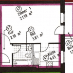 Vom Eingangsbereich aus befindet sich geradezu sogleich das Duschbad. Links vom Eingangsbereich aus befindet sich das geräumige Wohn-/Schlafzimmer mit Zugang zum Balkon. Von diesem Zimmer aus ist die Küche zugänglich.