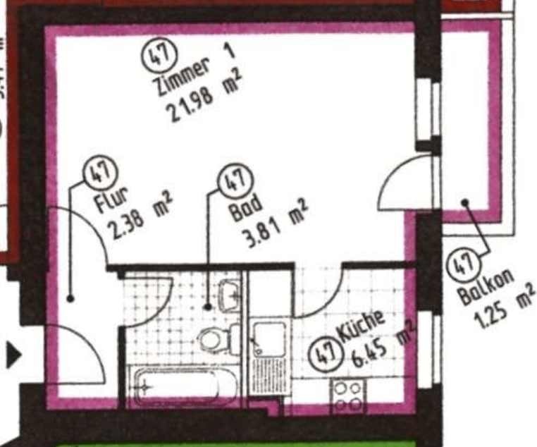Das um die Jahrhundertwende erbaute Wohn- und Geschäftshaus ist in ein Vorderhaus, einen Seitenflügel und in ein Hinterhaus aufgeteilt. Die vermietete 1-Zimmerwohnung befindet sich im 3.OG des Vorderhauses und hat eine Wohnfläche von ca. 35,87 m².