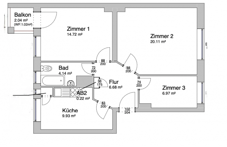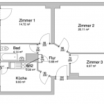 Eine Wohnfläche von ca. 64,15 m² verteilt sich auf einen Flur, eine Küche, ein Badezimmer mit Badewanne, ein Schlafzimmer, ein kleineres Zimmer sowie ein Wohnzimmer.